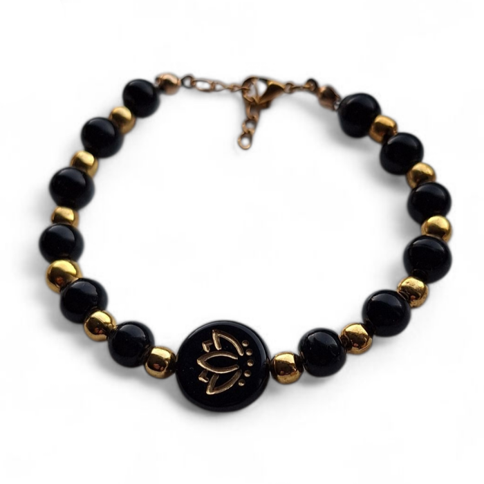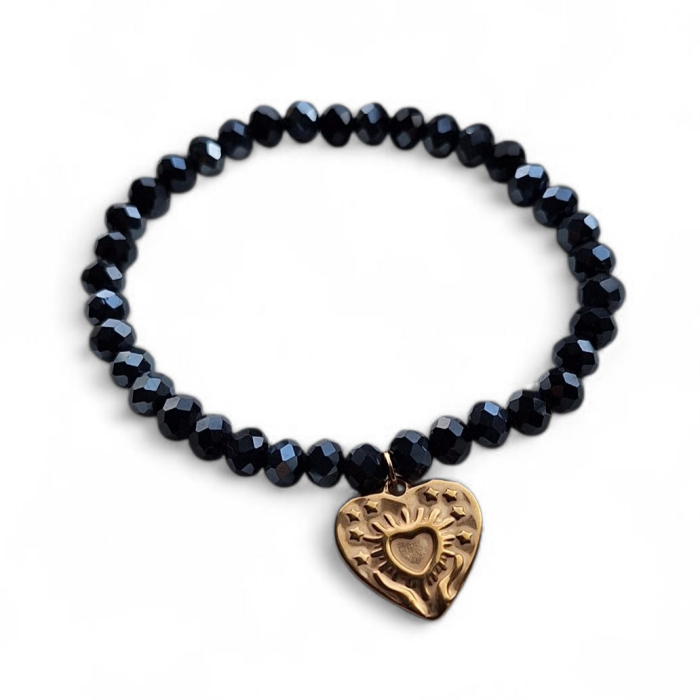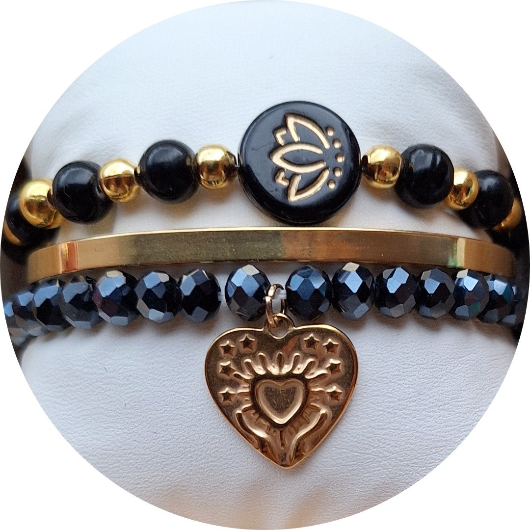 Armband 1: is een armband van glaskralen op elastisch draad in de kleur zwart met een goudkleurige bedel.