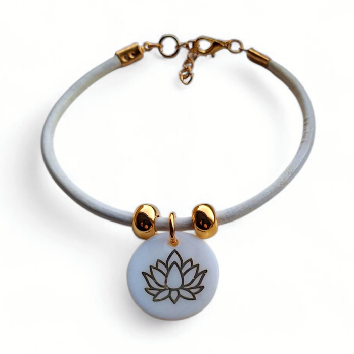 Armband 1: is een armbandje van leerdraad in de kleur wit, afgewerkt met goudkleurige stainless steel kralen en een natuurstenen bedel in wit en goudkleur. De armband heeft een karabijnslotje en een verlengkettinkje zodat hij altijd past.