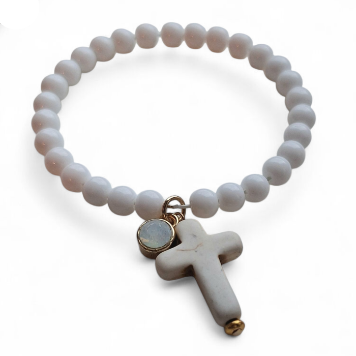 Armband 1: is een armband van glanzende, witte glaskralen geregen op elastisch draad, met twee bedels. Het kruisje is van 'been' en de andere bedel is van goudkleurig metaal, gevuld met een Swarovski steen.