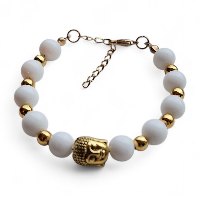 Armband 3:is een handgemaakte armband gemaakt met witte glaskralen, goudkleurige stainless steel kralen en is afgewerkt met een goudkleurige kraal in de vorm van een buddha. De armband is geregen op metaaldraad en wordt gesloten door middel van een karabijnslotje. Ook heeft hij een verlengkettinkje zodat hij altijd past.